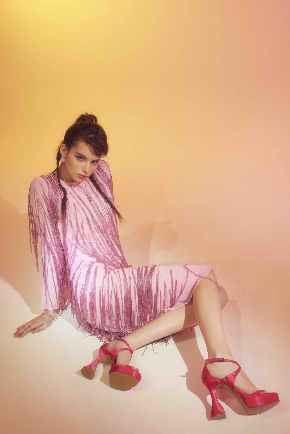 • MATERIALS : Satin, Swarovski Crystals, Sheepskin Lining, Kid Leather Socks, Metallic Buckles