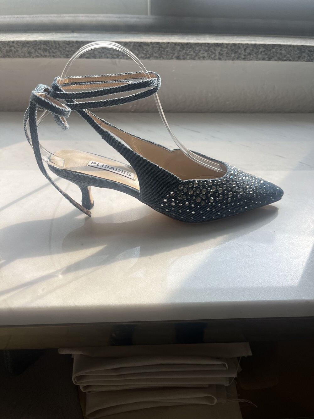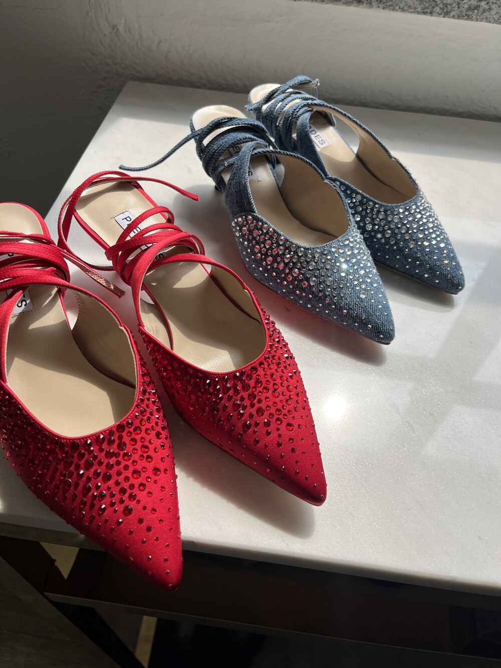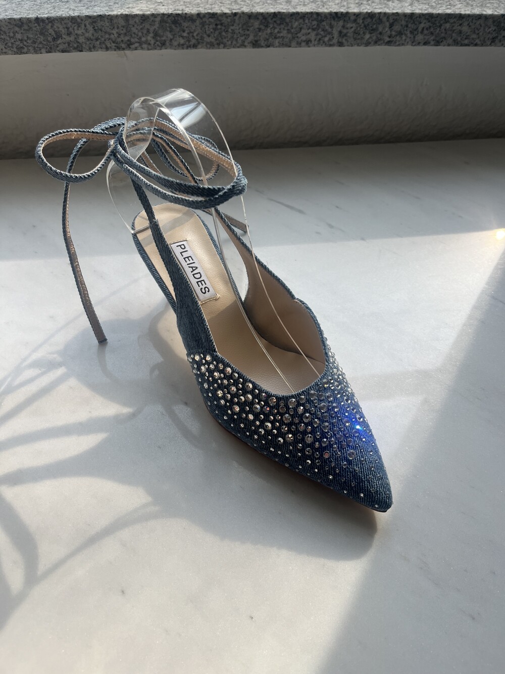 슬링백 시리즈의 베리에이션으로, 데님과 크리스탈을 매치하여 블루-화이트 조합의 아름다움이 더욱 돋보이는 슈즈 입니다.