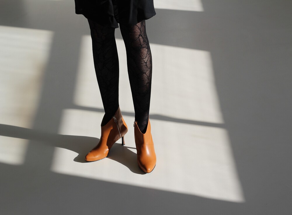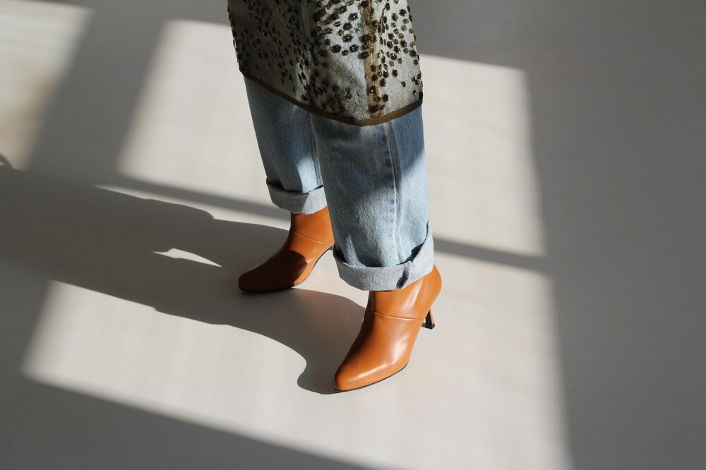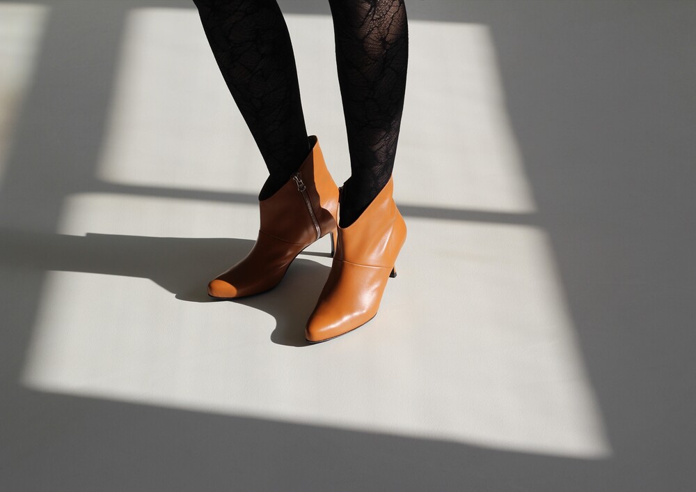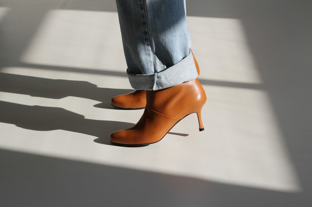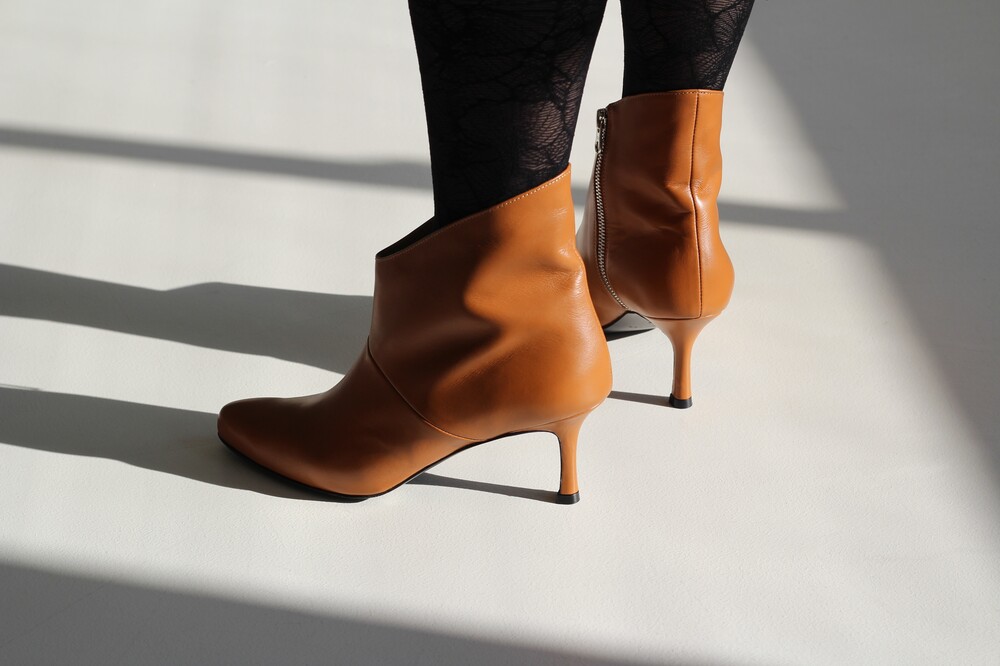 최고급 소가죽의 텍스쳐를 살리고, 샤프하게 떨어지는 독특한 라인을 표현해 준 앵클 부츠 입니다.