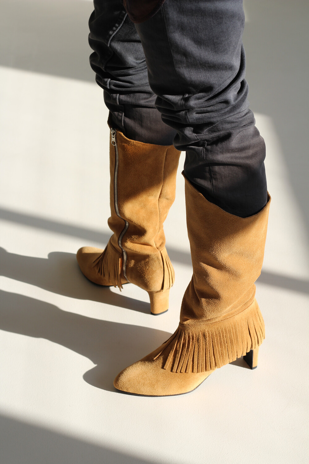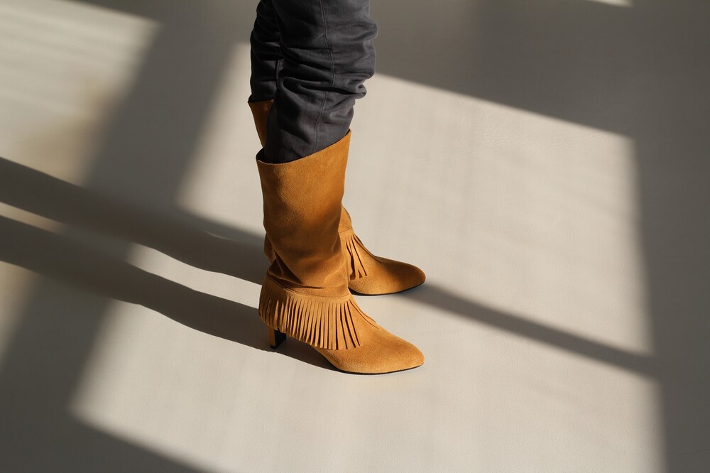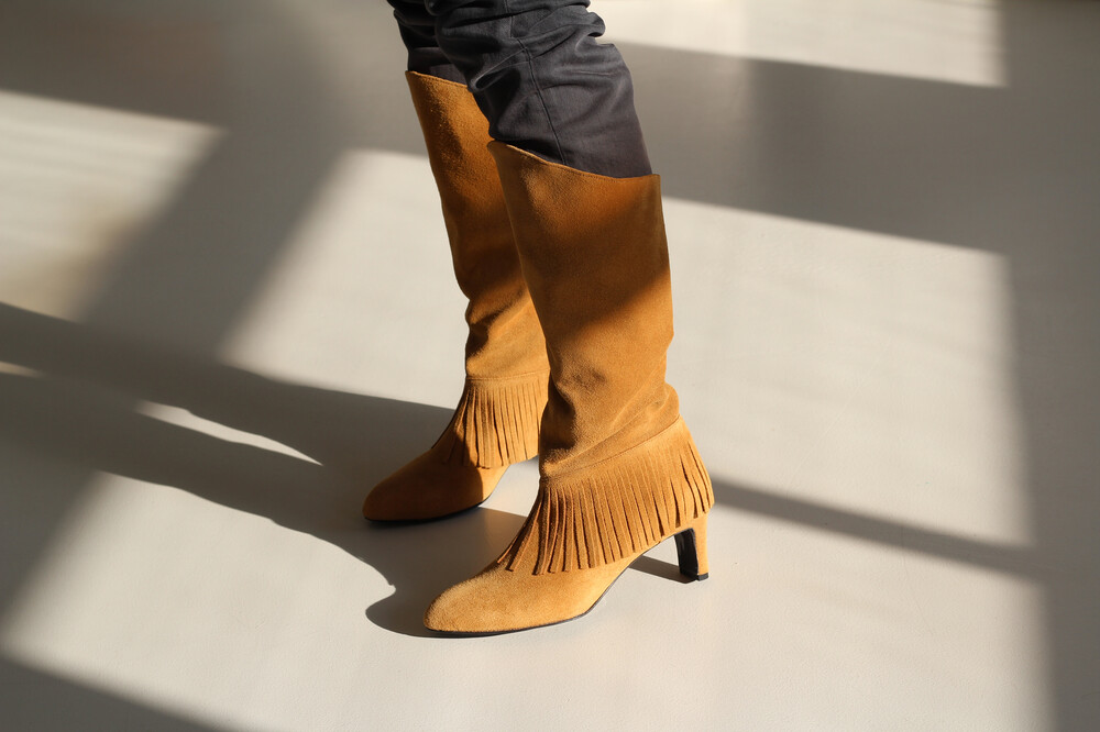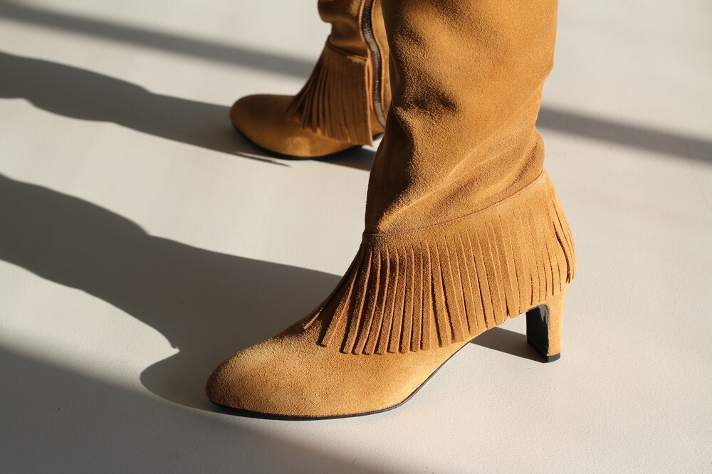 홑겹 카우 스웨이드의 소재감과 자연스러운 핏, 태슬 디테일이 매력적인 니하이 부츠 입니다.