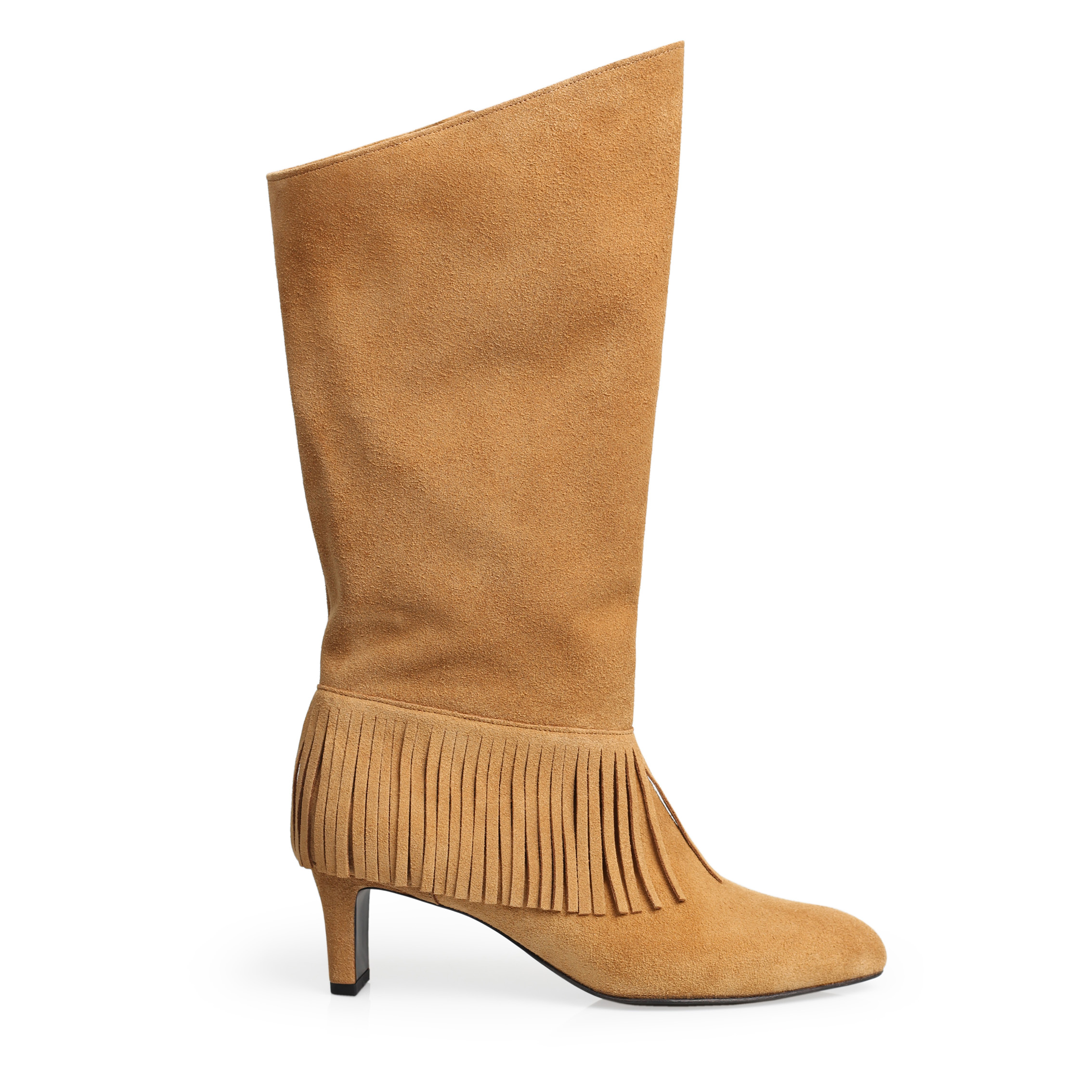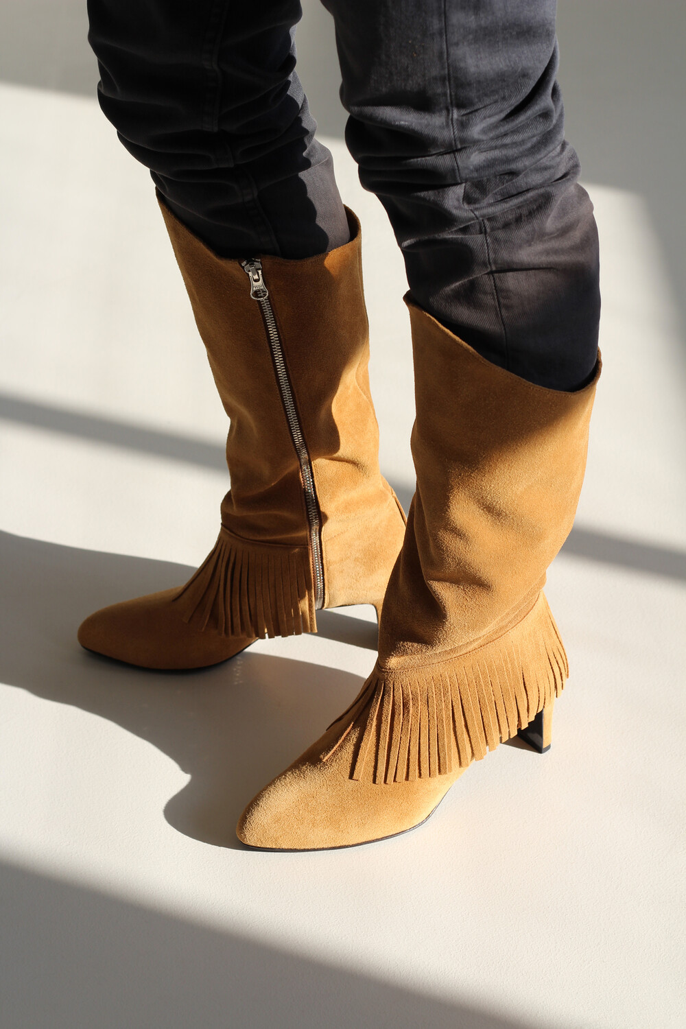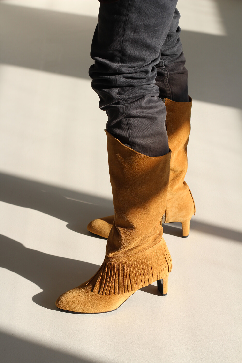 홑겹 카우 스웨이드의 소재감과 자연스러운 핏, 태슬 디테일이 매력적인 니하이 부츠 입니다.