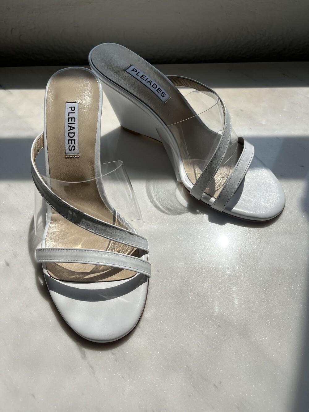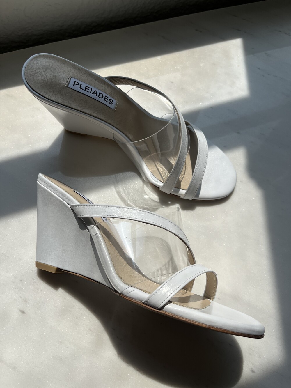 비대칭의 미니멀한 스트랩이 매력적인, 웨지힐 샌들 입니다.