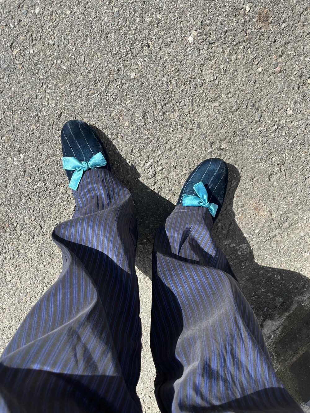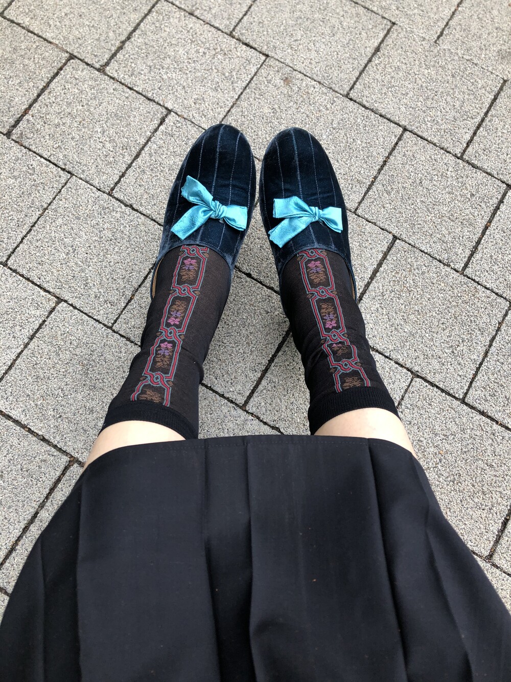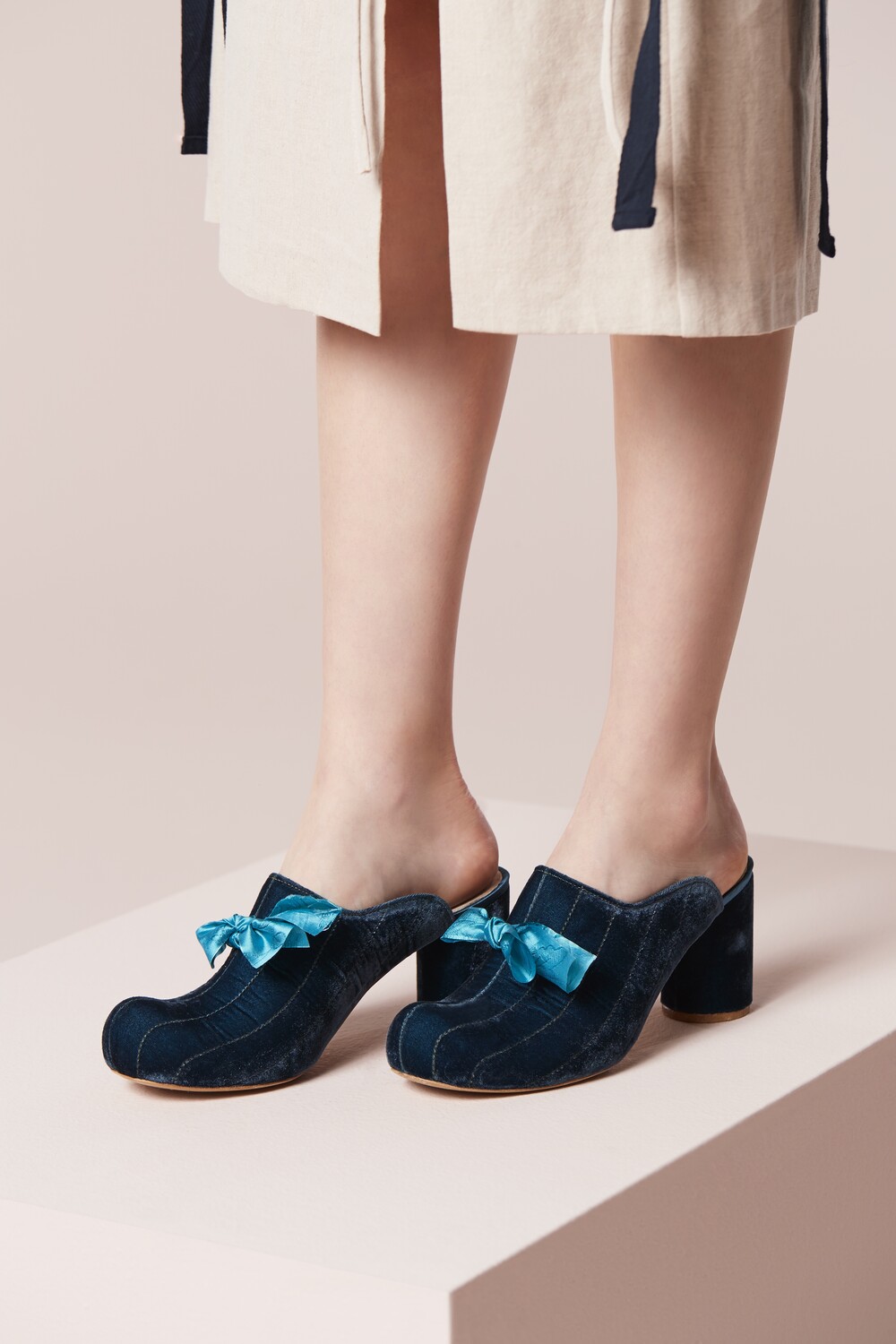 터쿼이즈 버전은 독특한 색감이 특히 매력적인 슈즈로, 짙은 푸른색의 벨벳이 다양한 스타일링을 받쳐주며 청량한 블루 색감의 명주 리본이 포인트가 되어 줍니다.